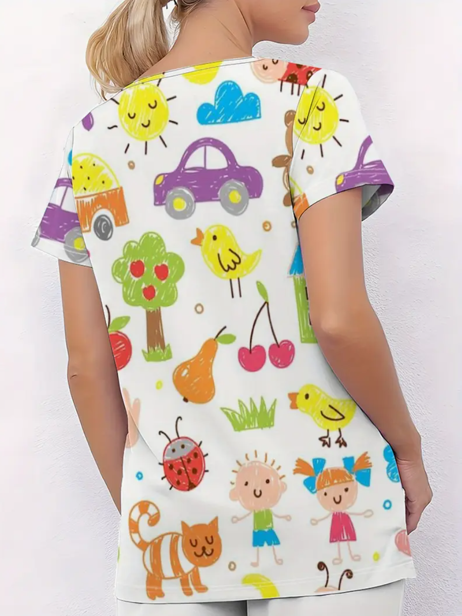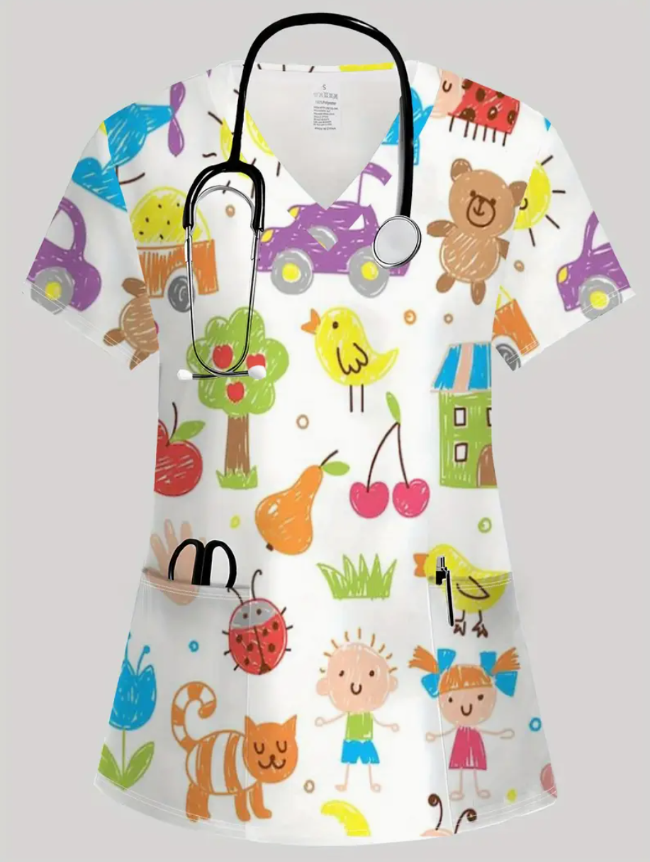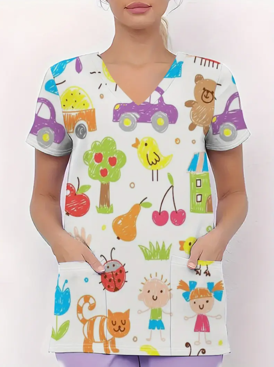 Camiseta de Cuello en V con Diseño 3D Nítido, Bolsillos y Tejidos Cómodos, Manga Corta para Uniforme Laboral o Profesional, Estiloso y Ligero. Para dentistas, higienistas dentales, asistentes, recepción.