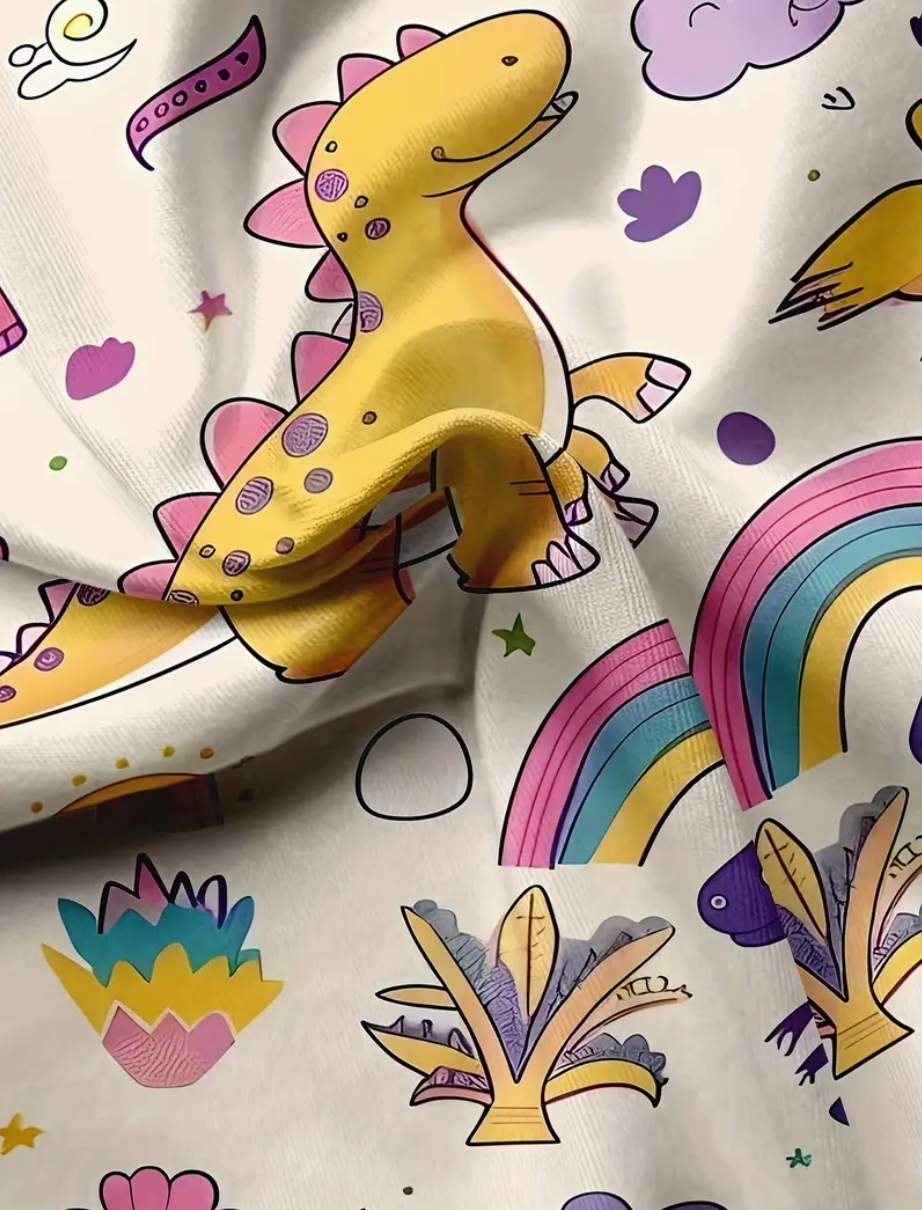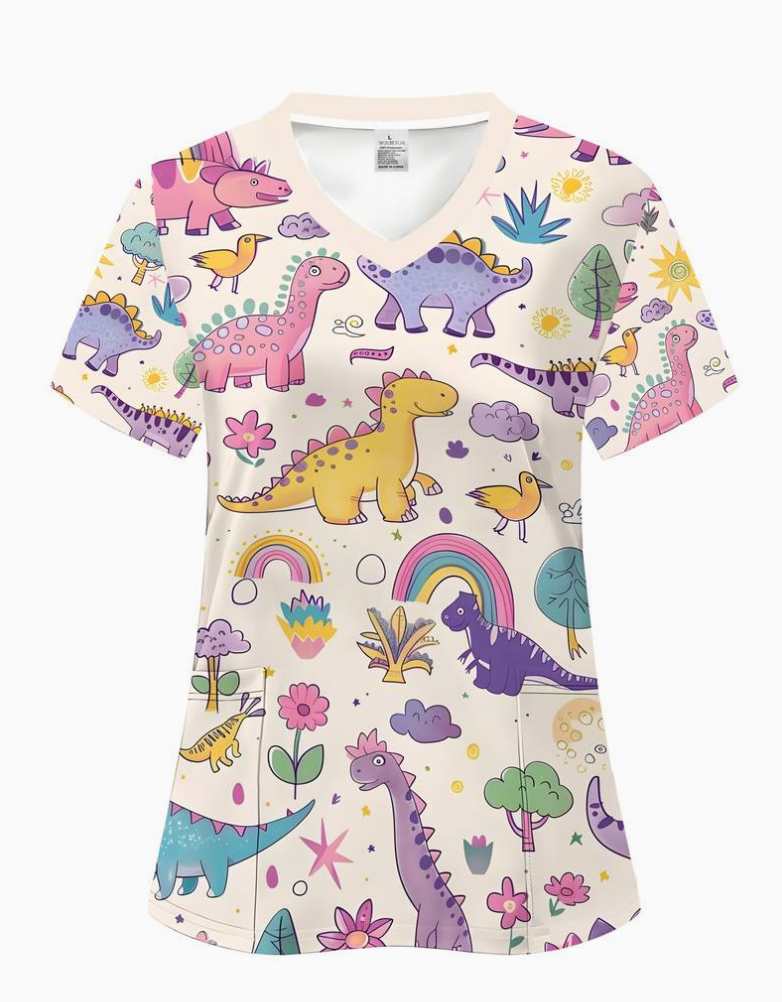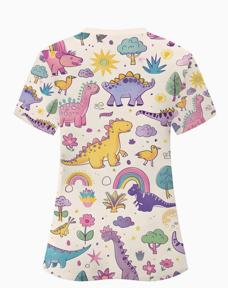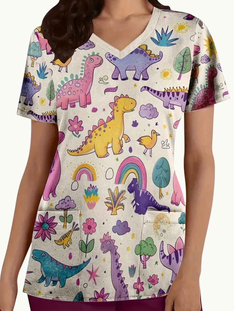 Estampado de Dinosaurios, Manga Corta y Cuello en V Casual, Lavable a Máquina, Regalo Dental