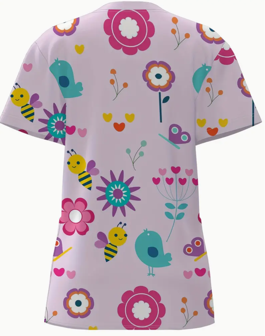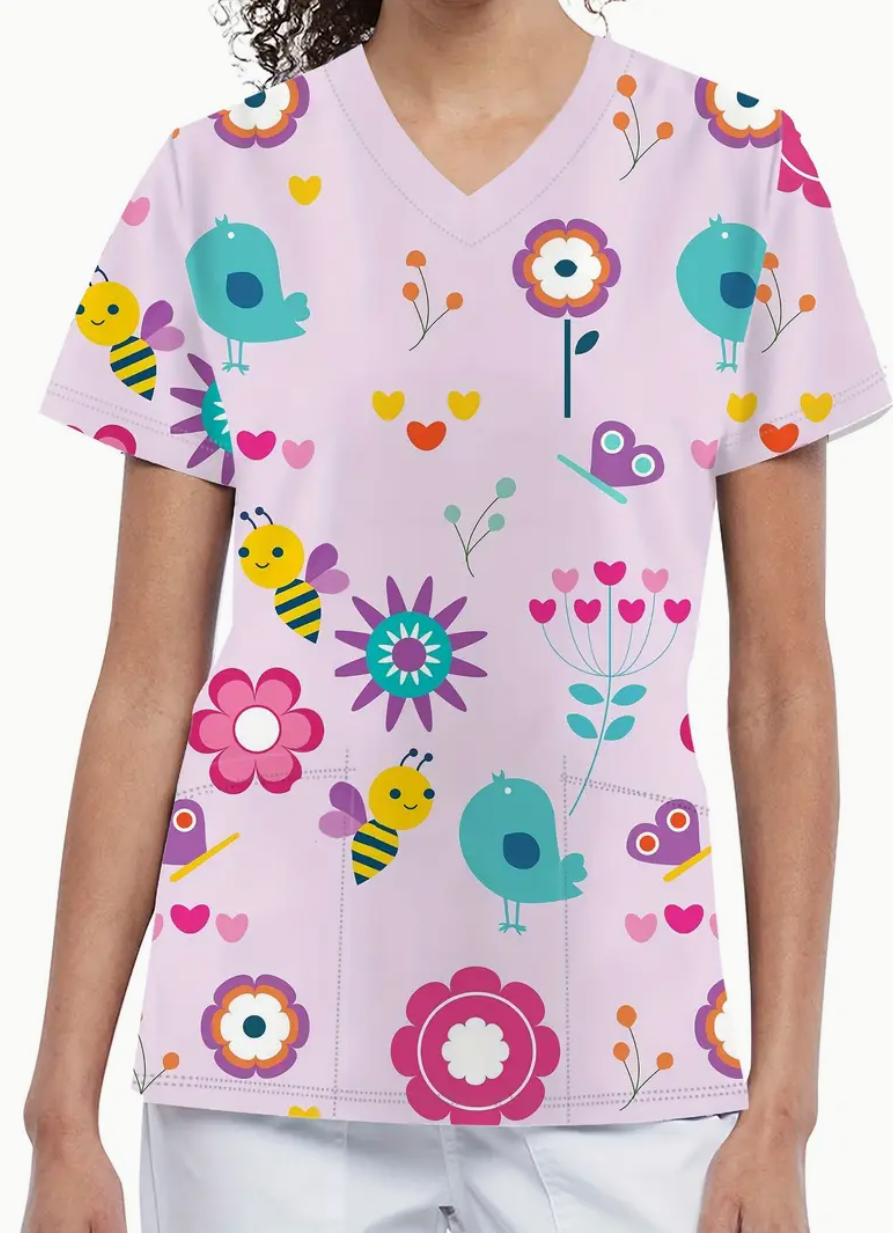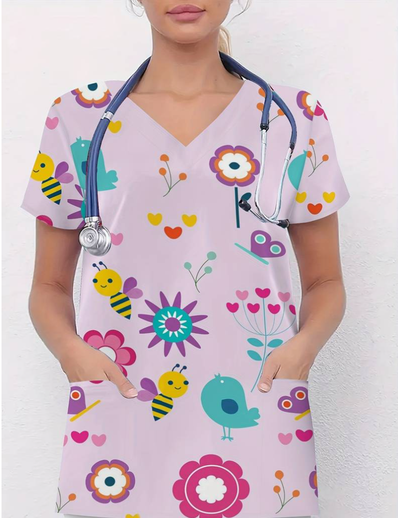 Uniforme de Enfermería para Mujer con Cuello en V – Estampado Floral y Abejas, Lavable a Máquina, Manga Corta con Abertura en el Dobladillo, Transpirable para Clínicas Dentales y Oficinas Ortopédicas, Accesorios Profesionales para Trabajo, Diseño Alegre, Material Duradero, Scrubs Casuales para Empleados de Clínica