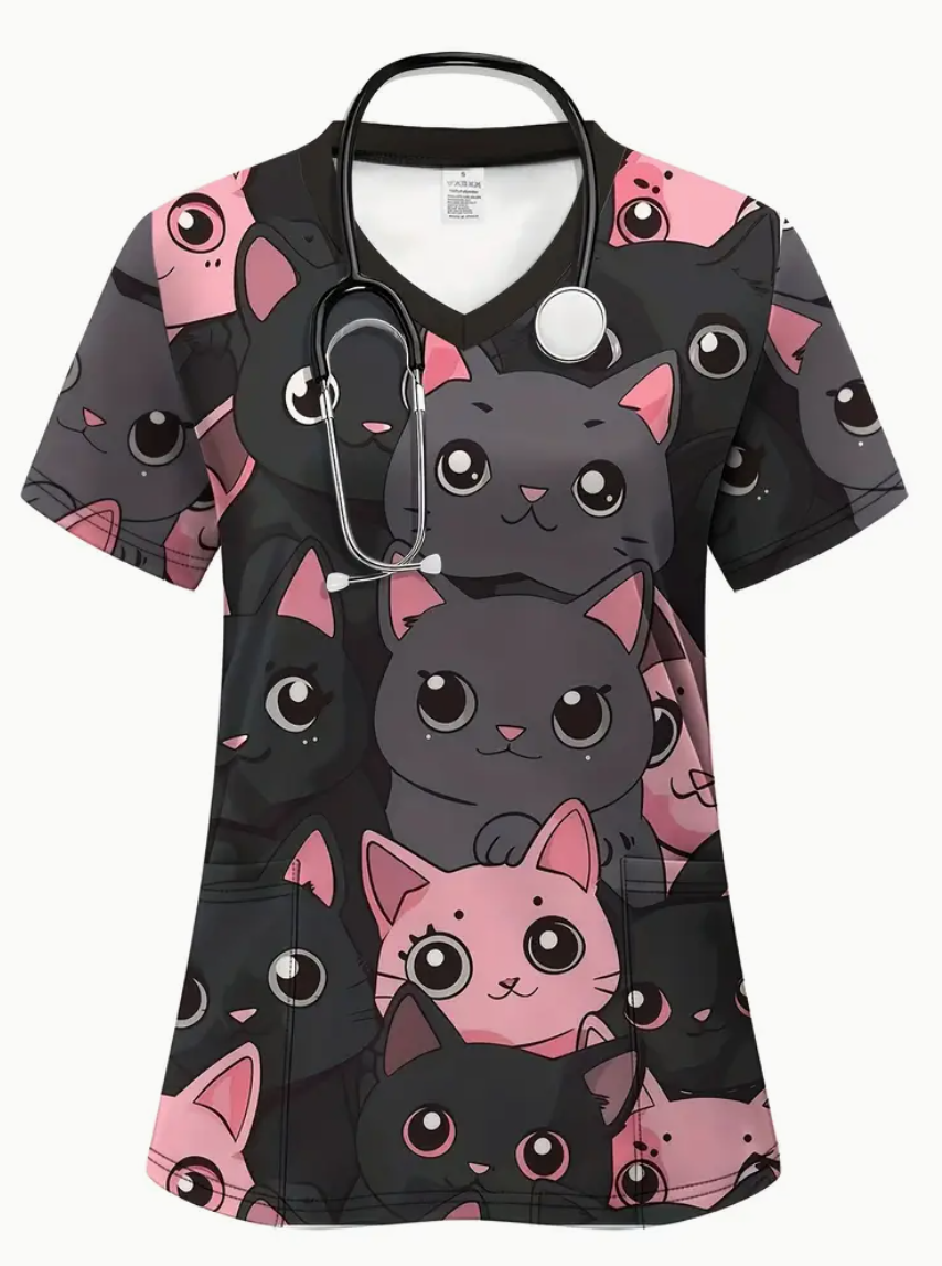 Estampado de Gatitos, Manga Corta y Cuello en V Casual para la Concienciación sobre la Salud Oral, Lavable a Máquina, Regalo Dental