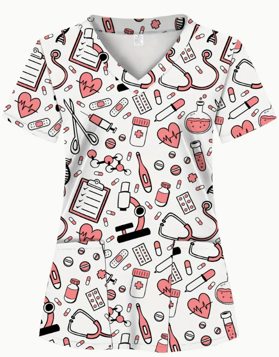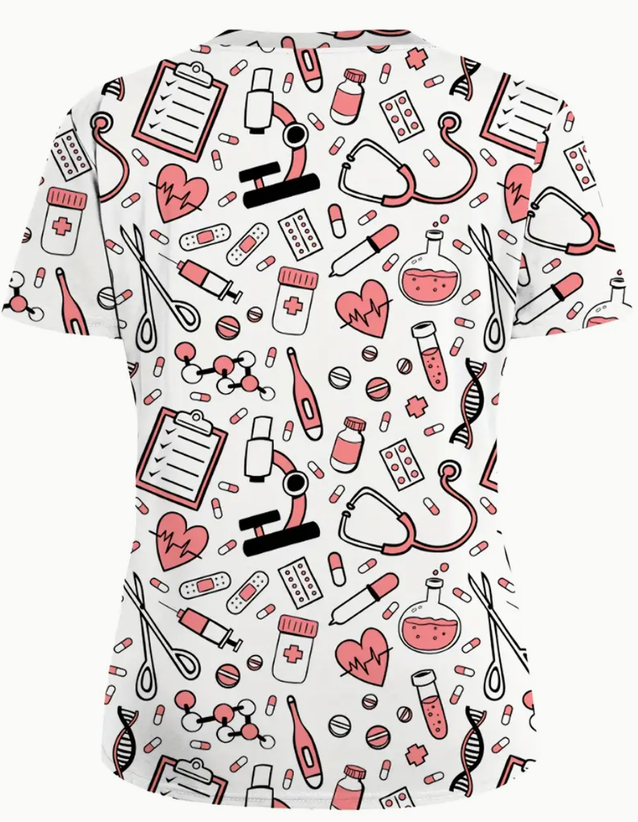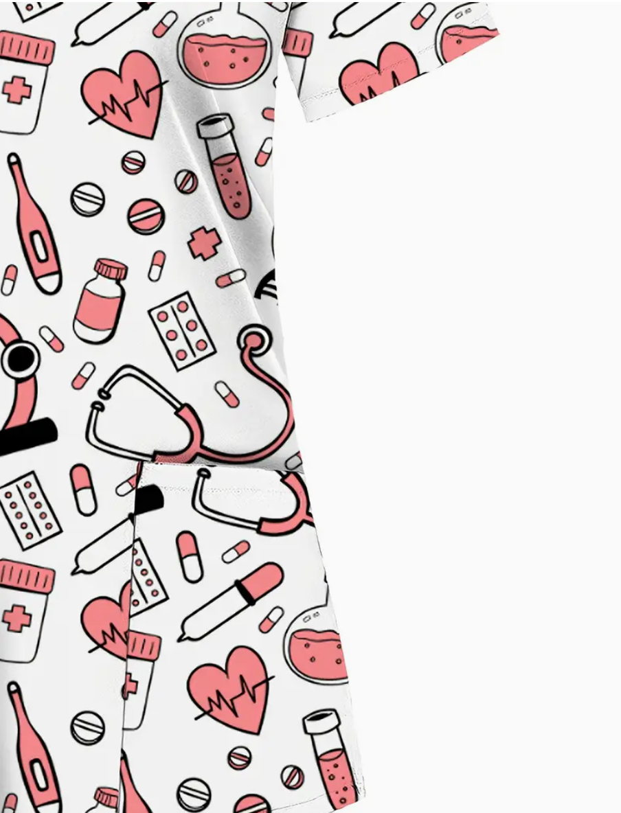 Camiseta de uniforme para mujeres con ilustraciones rosas – Uniforme suave y transpirable para enfermeras y profesionales de la salud, cuello en V, dos bolsillos, ideal para hospitales, clínicas dentales y instalaciones, ropa de trabajo cómoda | Elegantes uniformes | Diseño funcional, camisetas de uniforme