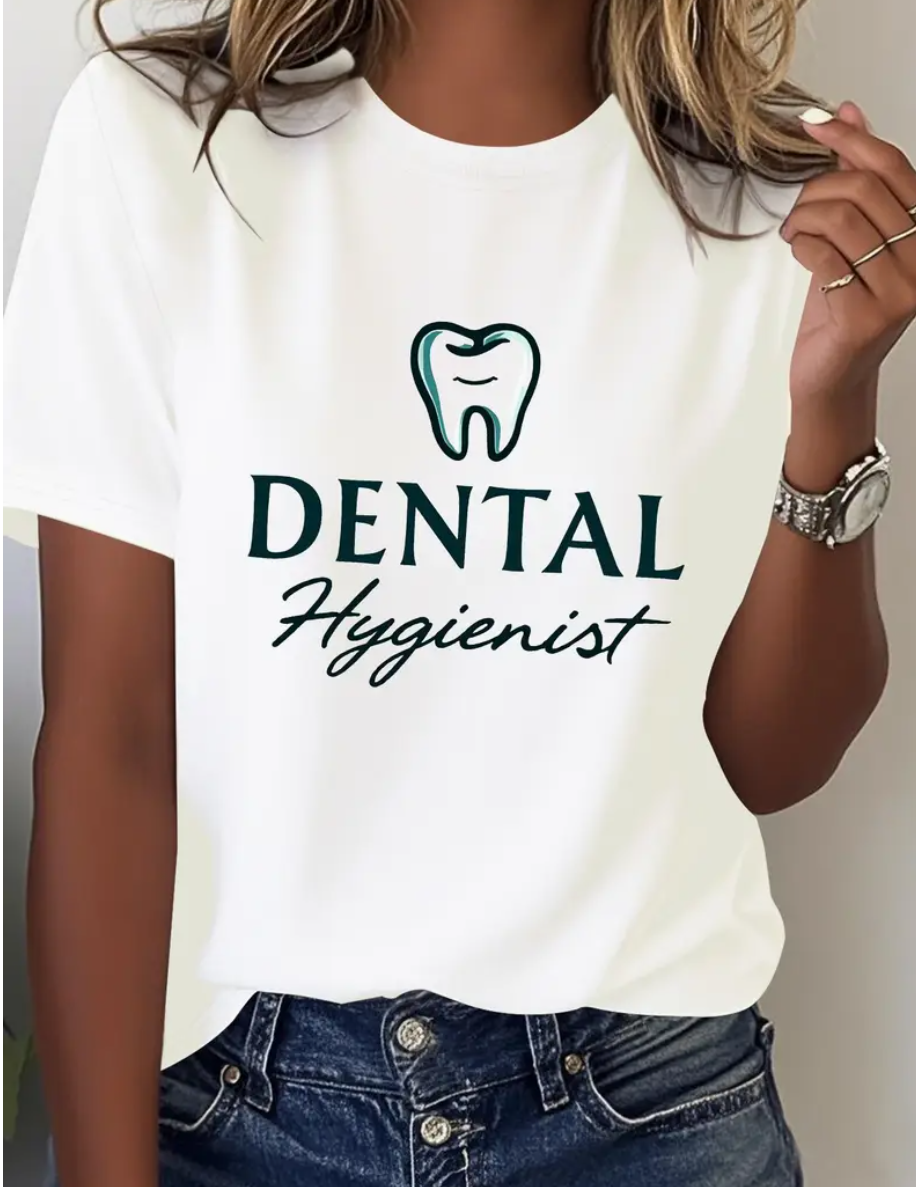 Camiseta mangas cortas de trabajo «Dental Hygienist» – Color blanco – Estampado de dientes Gris oscuro – Talla M